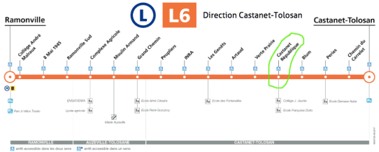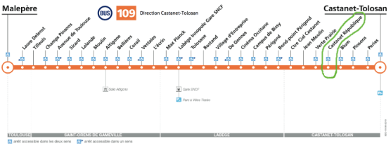 - depuis St Orens ou Labège : ligne 109, arrêt « Castanet république »