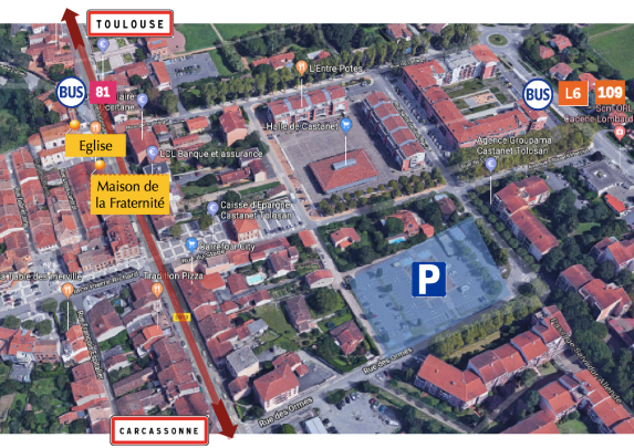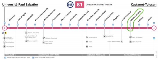 - depuis Toulouse : ligne 81 en partant du métro Université Paul Sabatier (ligne B), arrêt « mairie » OU la linéo 6 en partant du métro Ramonville (ligne B), arrêt « Castanet République »